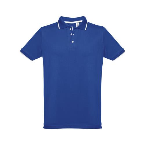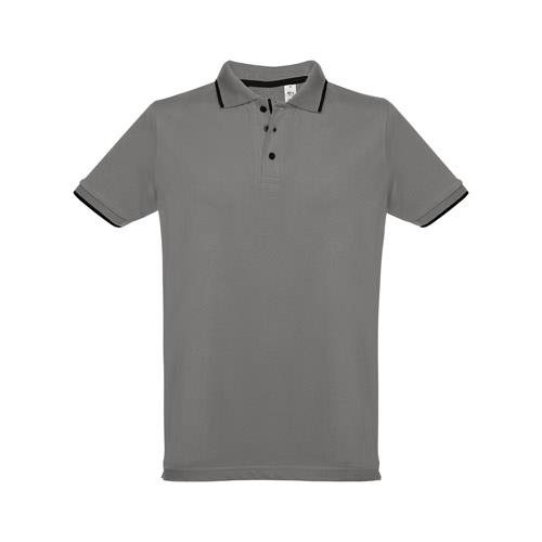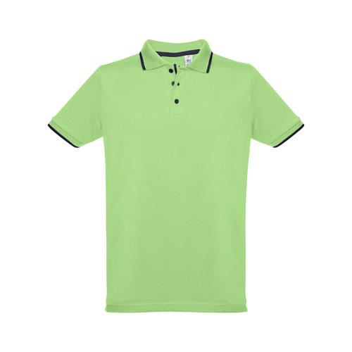 Męska dwukolorowa koszulka polo z krótkim rękawem, wykonana w 100% z bawełny zgrzebnej typu pique (210 g/m2) (kolor 183: 85% bawełna/15% wiskoza). Dwukolorowy kontrast na kołnierzu, rękawie i plisie. Posiada prążkowane mankiety i kołnierz. Wzmocniona plisa z 3 kontrastującymi kolorami guzików (dodatkowy guzik umieszczony w wewnętrznym szwie bocznym). Dopasowana talia i małe boczne rozcięcia na dole. Rozmiary: S, M, L, XL, XXL