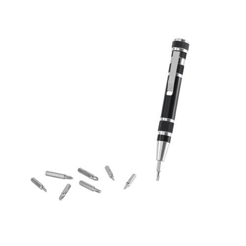 Miniaturowy zestaw narzędzi w kształcie długopisu, śrubokręt z 8 różnymi wymiennymi końcówkami. Praktyczne narzędzie z klipsem i opcją przechowywania wszystkich elementów w górnej części korpusu (posiada pokrywę). o16 x 109 mm