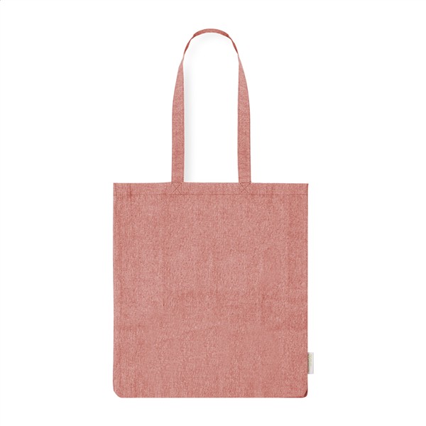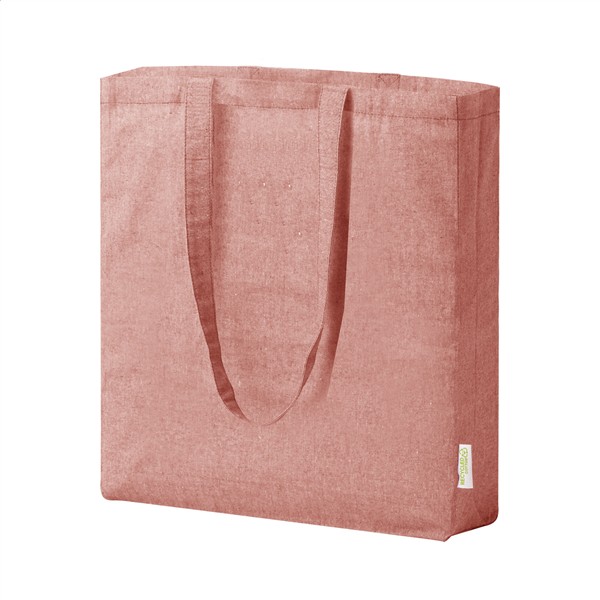 Torba na zakupy z bawełny pochodzącej z recyklingu z szerokim dnem, długimi uchwytami i charakterystyczną metką informującą o bawełnie pochodzącej z recyklingu. 100% bawełna z recyklingu, 140 g/m2.