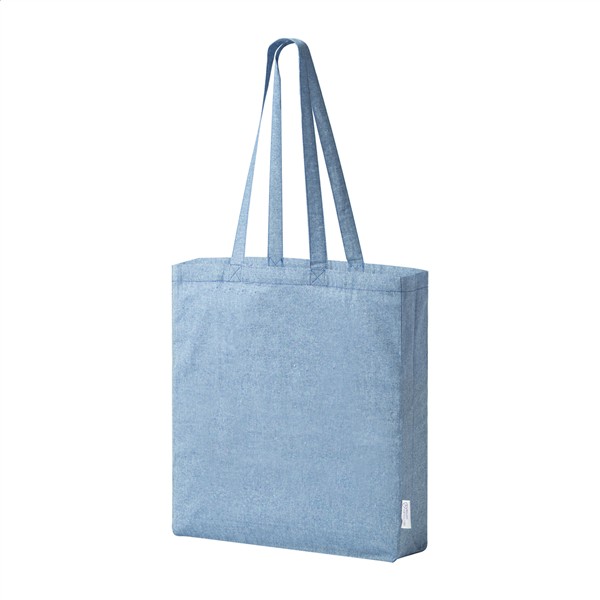 Torba na zakupy z bawełny pochodzącej z recyklingu z szerokim dnem, długimi uchwytami i charakterystyczną metką informującą o bawełnie pochodzącej z recyklingu. 100% bawełna z recyklingu, 140 g/m2.