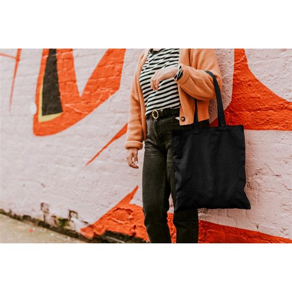 Torba na zakupy, posiada długie uchwyty umożliwiające noszenie na ramieniu, produkt wykonany z bawełny o gramaturze 140 g/m2