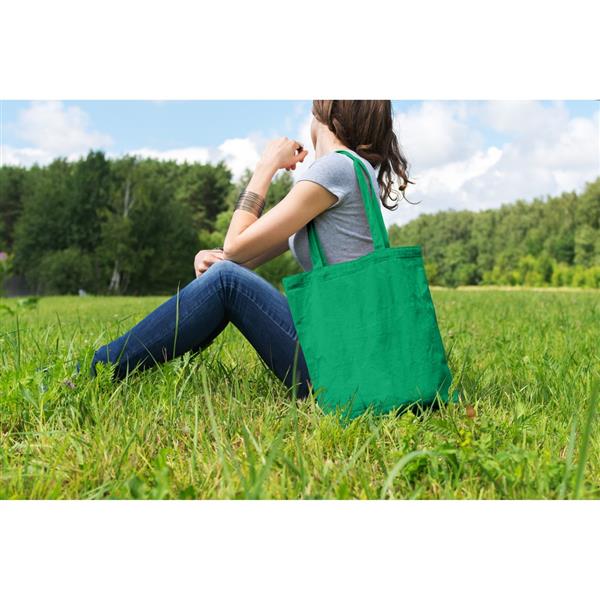 Torba na zakupy, posiada długie uchwyty umożliwiające noszenie na ramieniu, produkt wykonany z bawełny o gramaturze 140 g/m2