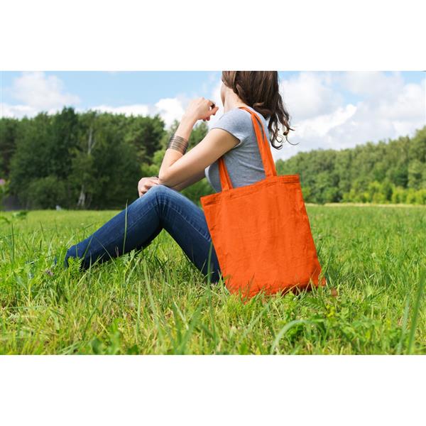 Torba na zakupy, posiada długie uchwyty umożliwiające noszenie na ramieniu, produkt wykonany z bawełny o gramaturze 140 g/m2