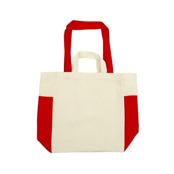 Torba na zakupy, posiada krótkie uchwyty oraz długie uchwyty umożliwiające noszenie na ramieniu, 2 kieszenie boczne dopasowane kolorystycznie do długich uchwytów, produkt wykonany z bawełny o gramaturze 240 g/m2