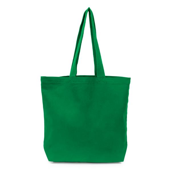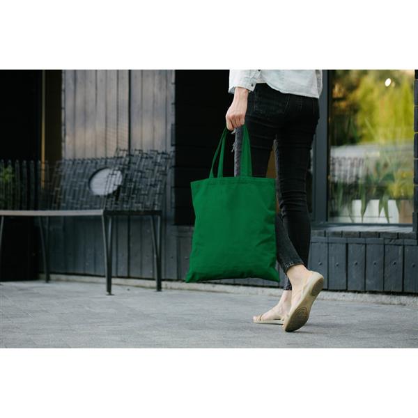 Torba na zakupy z szerokim dnem, posiada długie uchwyty wykonane z brezentu (długość 70 cm, szerokość 40 mm) umożliwiające noszenie na ramieniu, produkt wykonany z bawełny o gramaturze 240 g/m2