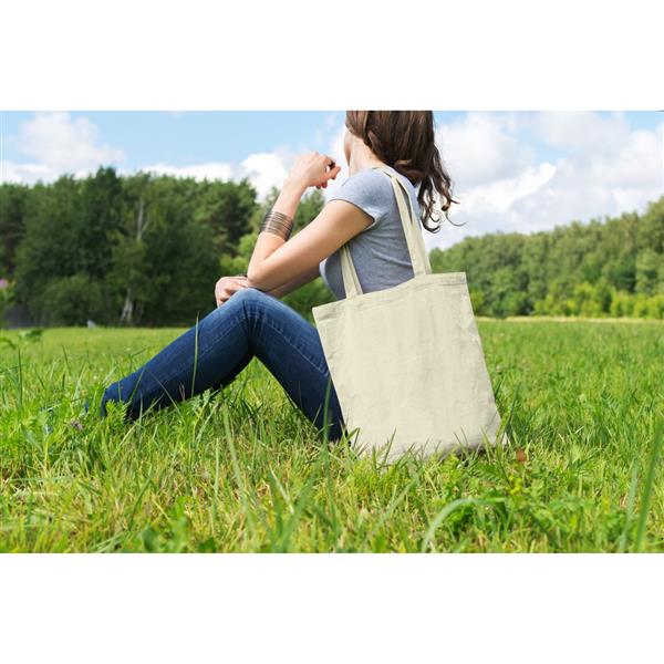 Torba na zakupy, posiada długie uchwyty umożliwiające noszenie na ramieniu, produkt wykonany z bawełny o gramaturze 140 g/m2, zgodna z certyfikatem OEKO-TEX Standard 100