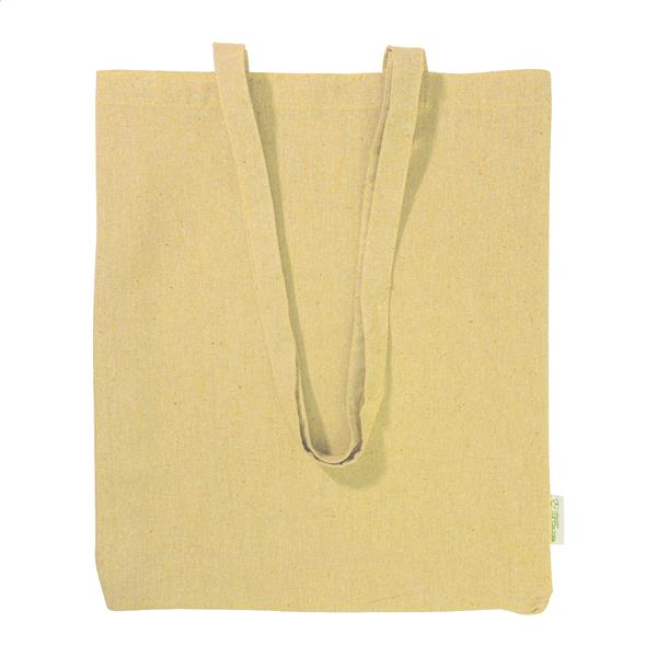 Torba na zakupy wielokrotnego użytku z bawełny z recyklingu z długimi uchwytami i charakterystyczną metką. 100% bawełna z recyklingu, 140 g/m2.
