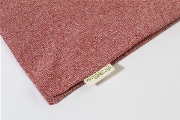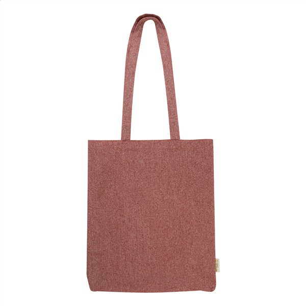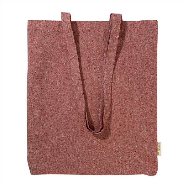 Torba na zakupy wielokrotnego użytku z bawełny z recyklingu z długimi uchwytami i charakterystyczną metką. 100% bawełna z recyklingu, 140 g/m2.
