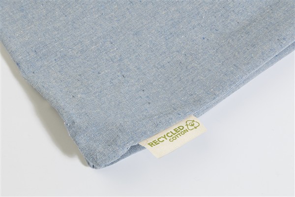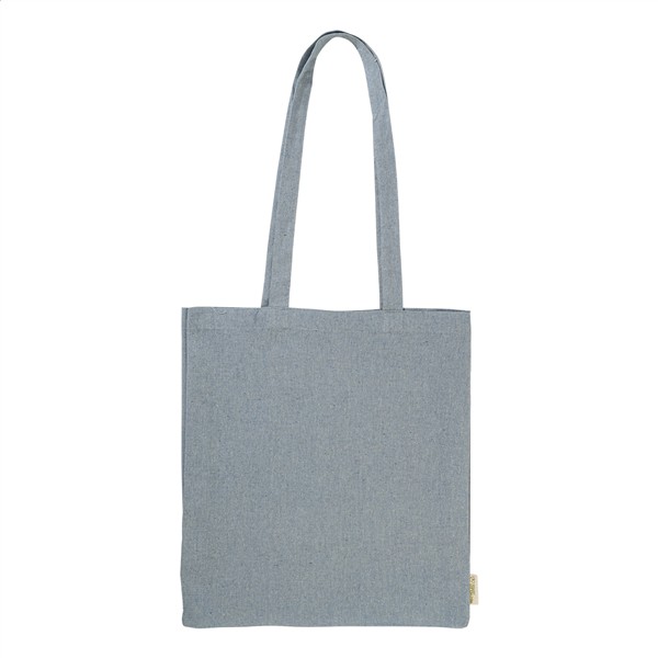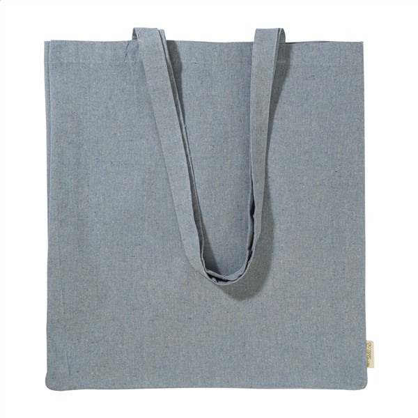 Torba na zakupy wielokrotnego użytku z bawełny z recyklingu z długimi uchwytami i charakterystyczną metką. 100% bawełna z recyklingu, 140 g/m2.