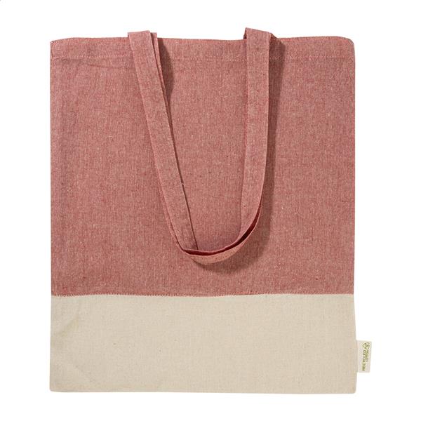 Dwukolorowa torba na zakupy z bawełny pochodzącej z recyklingu, z długimi uchwytami i charakterystyczną metką informującą o bawełnie pochodzącej z recyklingu. 100% bawełna z recyklingu, 120 g/m2.