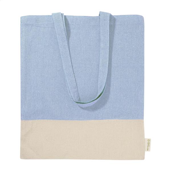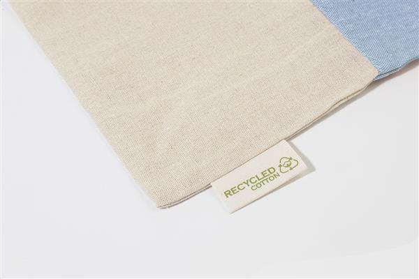 Dwukolorowa torba na zakupy z bawełny pochodzącej z recyklingu, z długimi uchwytami i charakterystyczną metką informującą o bawełnie pochodzącej z recyklingu. 100% bawełna z recyklingu, 120 g/m2.