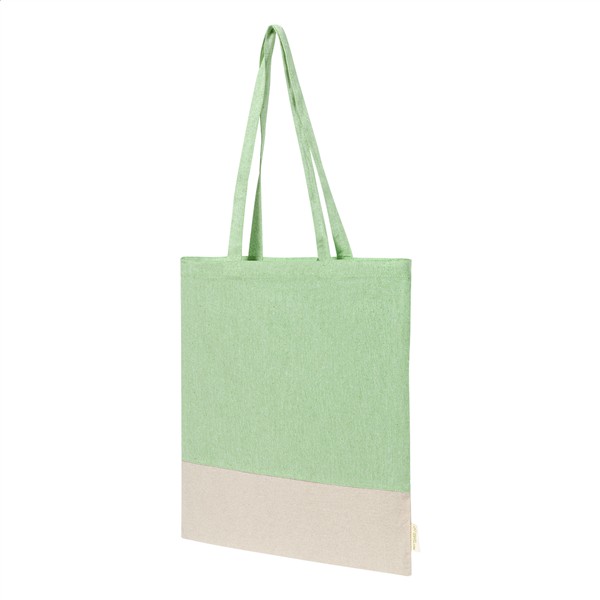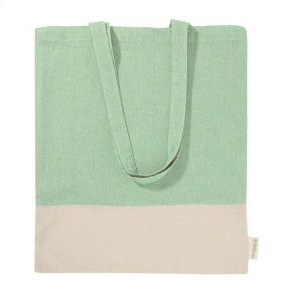 Dwukolorowa torba na zakupy z bawełny pochodzącej z recyklingu, z długimi uchwytami i charakterystyczną metką informującą o bawełnie pochodzącej z recyklingu. 100% bawełna z recyklingu, 120 g/m2.