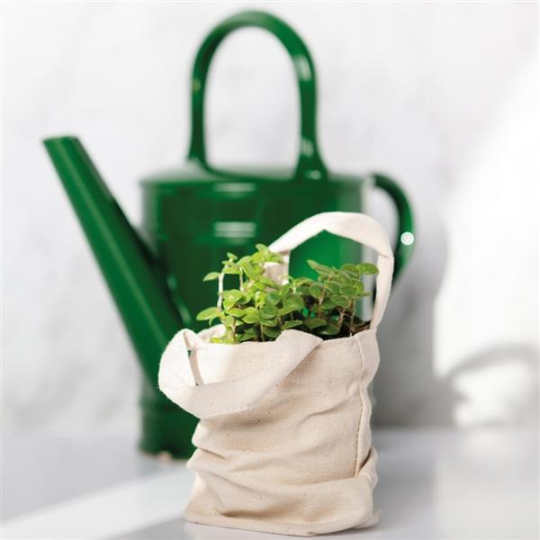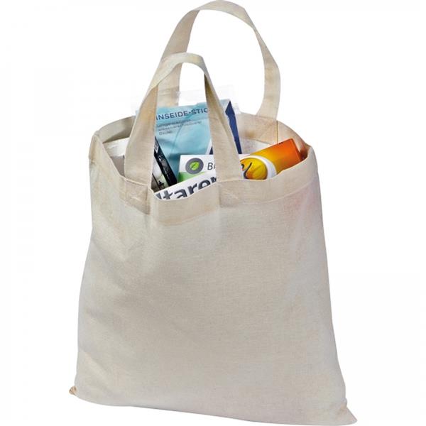 Mała torba bawełniana w naturalnym kolorze z krótkimi uszami (12 cm), gramatura 140 g/m2. Certyfikat ECO Tex standard 100.