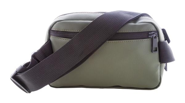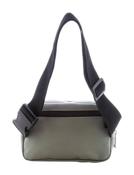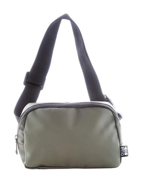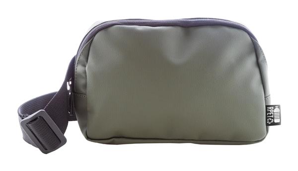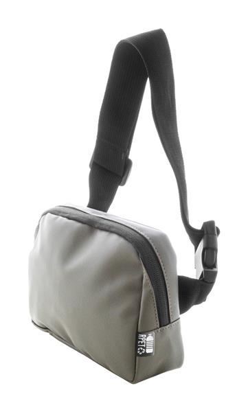Wodoodporna torba biodrowa RPET z 2 przegrodami zapinanymi na suwak, siateczkowymi kieszeniami wewnętrznymi i regulowanym paskiem. Poliester RPET 600D powlekany poliuretanem, z charakterystyczną metką RPET.