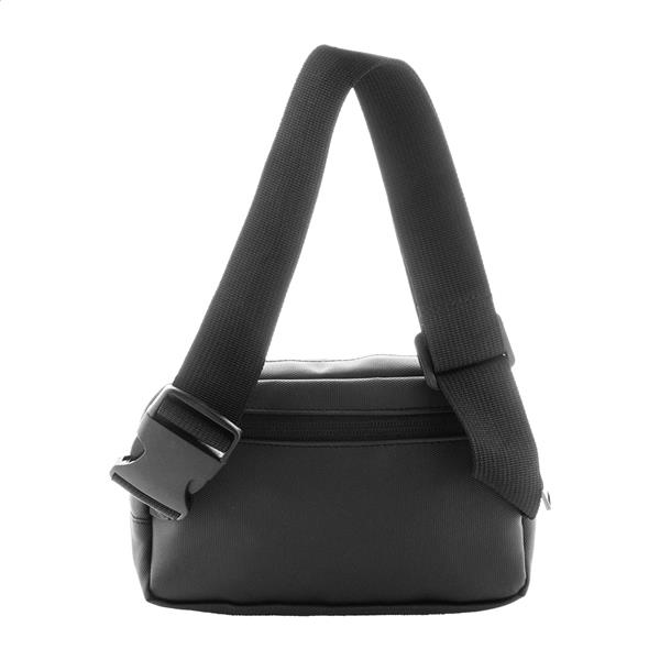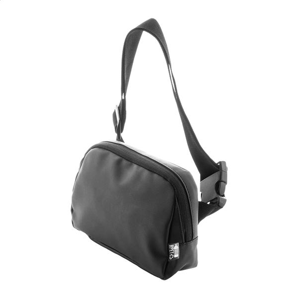Wodoodporna torba biodrowa RPET z 2 przegrodami zapinanymi na suwak, siateczkowymi kieszeniami wewnętrznymi i regulowanym paskiem. Poliester RPET 600D powlekany poliuretanem, z charakterystyczną metką RPET.