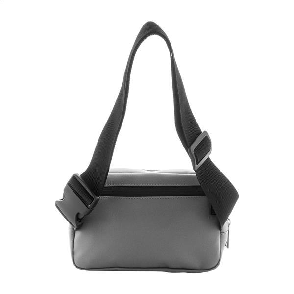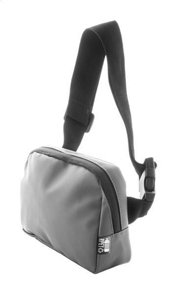 Wodoodporna torba biodrowa RPET z 2 przegrodami zapinanymi na suwak, siateczkowymi kieszeniami wewnętrznymi i regulowanym paskiem. Poliester RPET 600D powlekany poliuretanem, z charakterystyczną metką RPET.