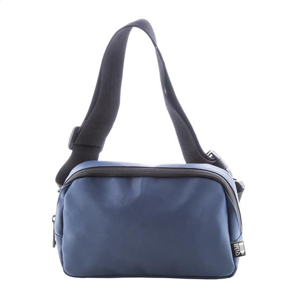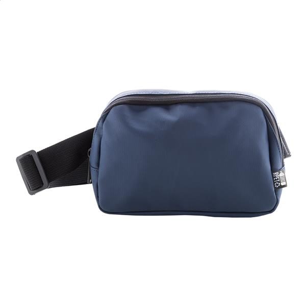 Wodoodporna torba biodrowa RPET z 2 przegrodami zapinanymi na suwak, siateczkowymi kieszeniami wewnętrznymi i regulowanym paskiem. Poliester RPET 600D powlekany poliuretanem, z charakterystyczną metką RPET.