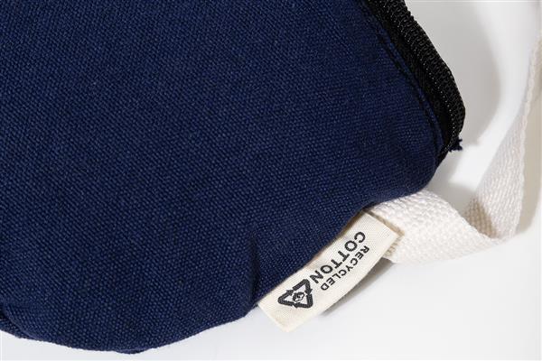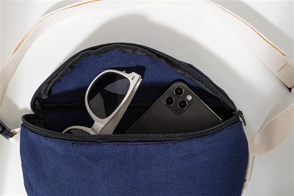 Torba biodrowa z płótna z recyklingu, z przegrodą na zamek i regulowanym paskiem. 70% bawełny z recyklingu i 30% poliestru z recyklingu. Z charakterystyczną metką z bawełny z recyklingu.