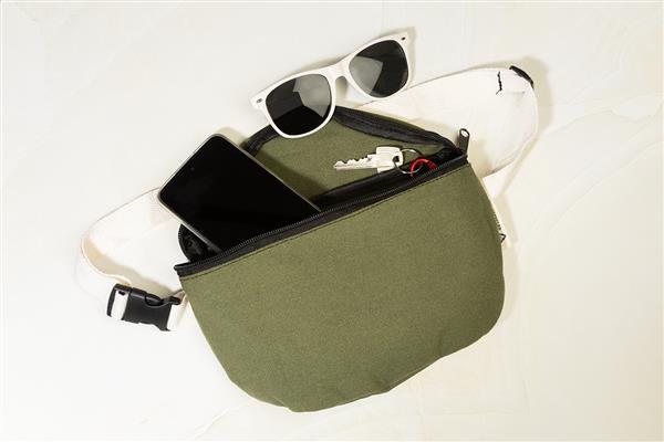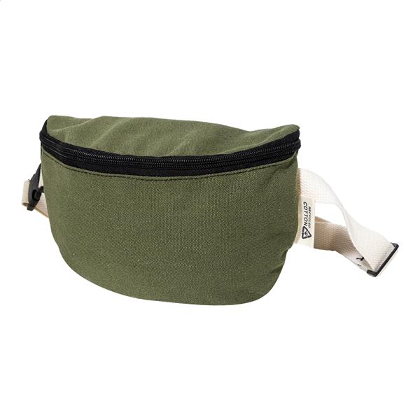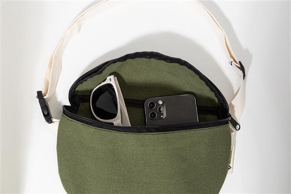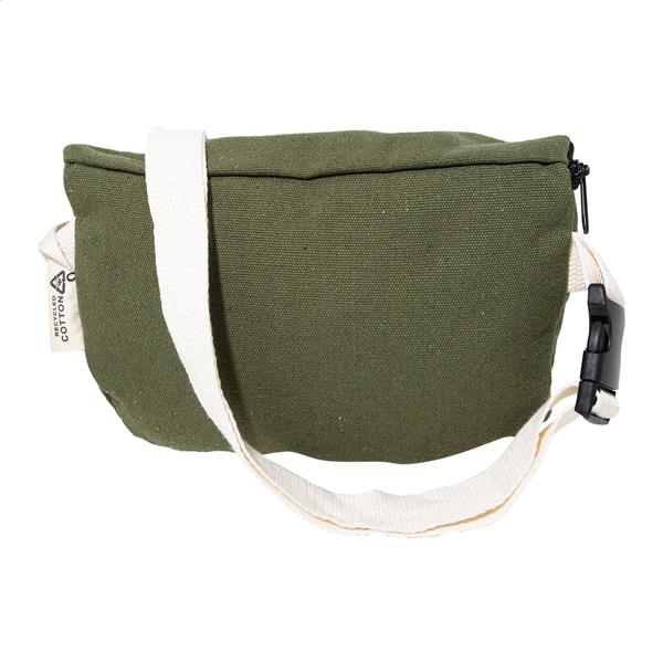 Torba biodrowa z płótna z recyklingu, z przegrodą na zamek i regulowanym paskiem. 70% bawełny z recyklingu i 30% poliestru z recyklingu. Z charakterystyczną metką z bawełny z recyklingu.