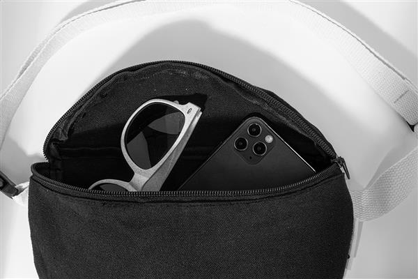 Torba biodrowa z płótna z recyklingu, z przegrodą na zamek i regulowanym paskiem. 70% bawełny z recyklingu i 30% poliestru z recyklingu. Z charakterystyczną metką z bawełny z recyklingu.