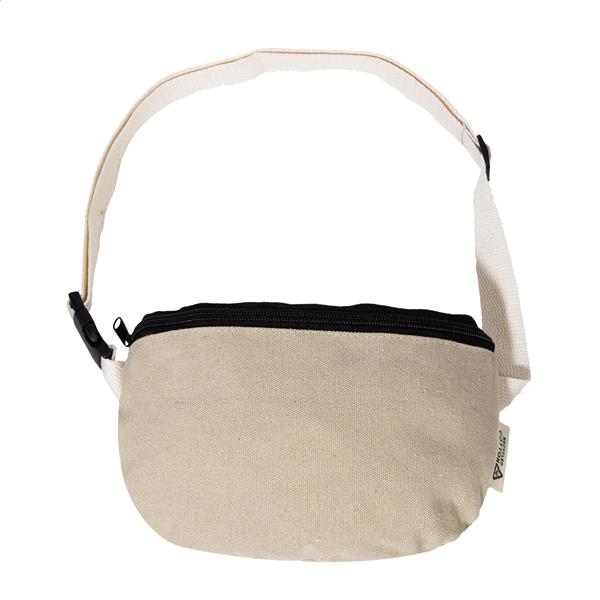 Torba biodrowa z płótna z recyklingu, z przegrodą na zamek i regulowanym paskiem. 70% bawełny z recyklingu i 30% poliestru z recyklingu. Z charakterystyczną metką z bawełny z recyklingu.
