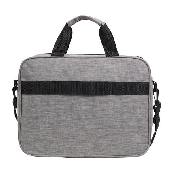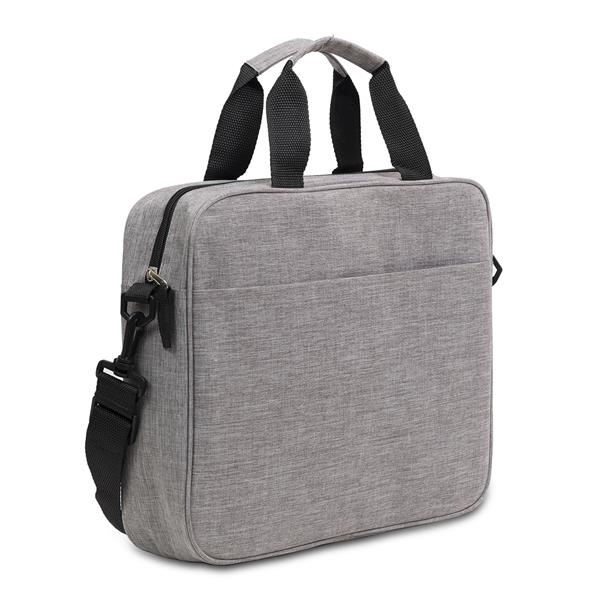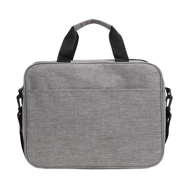 Wyściełana torba na laptop z tkaniny 300D powlekanej PVC. Główna przegroda przeznaczona na laptop 15″. Dodatkowa kieszeń zewnętrzna zapiana na rzep. Wewnątrz podszewka 210T. Dopinany pasek pozwala nosić torbę na ramieniu. Dodatkowy pasek z tyłu torby pozwala umieścić ją na rączce od walizki.