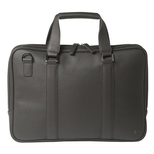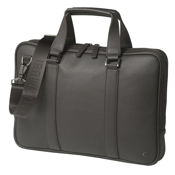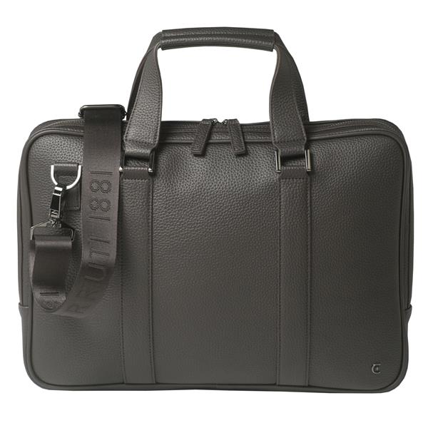 Torba komputerowa Hamilton firmy CERRUTI 1881 o ładnym ciemnobrązowym kolorze, skórzana imitacja drobnoziarnistej skóry, wysokiej jakości nylonowa podszewka. Wnętrze torby posiada specjalną wewnętrzną sekcję do przechowywania i ochrony 15-calowego laptopa. Torba jest wyposażona w zdejmowany i regulowany pasek na ramię z logo CERRUTI 1881. Charakterystyczny chromowany monogram CRR z CERRUTI 1881 przedstawiony jest w przedniej części torby na dokumenty. Na bocznej ściance ładna metalowa płytka pistoletu widnieje logo CERRUTI 1881. Zamki i zamki błyskawiczne są w kolorze metalowym pistoletu. Torba jest absolutnie doskonała i każdy doceniłby wysoki poziom szczegółów wykończenia zarówno od wewnątrz, jak i z zewnątrz tej torby na dokumenty.