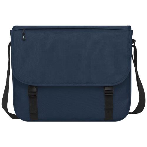 Ekologiczna torba na laptopa z plastiku z recyclingu z certyfikatem GRS wykonana w 40 % z materiałów pochodzących z recyklingu. Posiada dużą główną komorę zamykaną na zamek błyskawiczny z wyściełanym pokrowcem na 15 cali laptopa i przednią komorę (obie zamykane na rzep). W zestawie zamknięcie z pokrywą oraz z zapinaną na zamek kieszonką i zapięciem na klamrę. Posiada wygodny wyściełany i regulowany pasek na ramię i prowadnice wózka z tyłu.