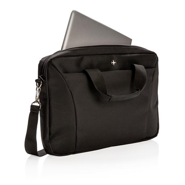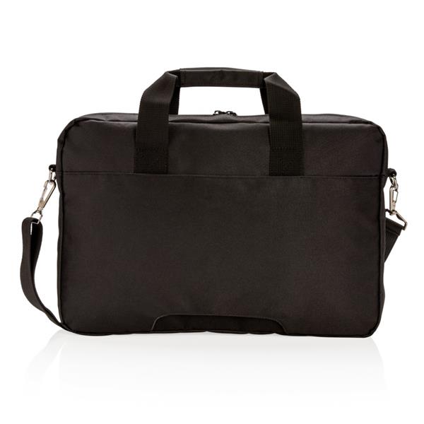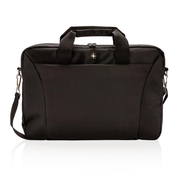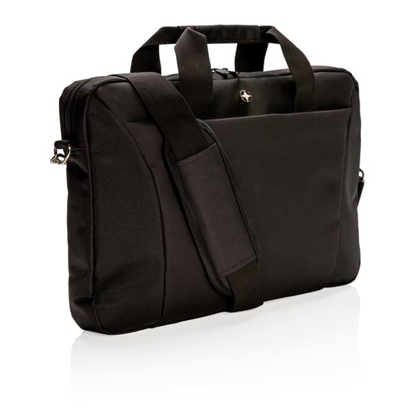 Torba na laptopa 15,4″, wykonana z poliestru 600D i 1680D, wewnątrz kieszeń na tablet, z przodu kieszeń na zamek błyskawiczny z miejscem na przybory do pisania i inne akcesoria, regulowany i odpinany pasek na ramię umożliwia noszenie torby na różne sposoby, posiada mocowanie do walizki, nie zawiera PVC, ślad węglowy produktu: 4,07 kg CO2