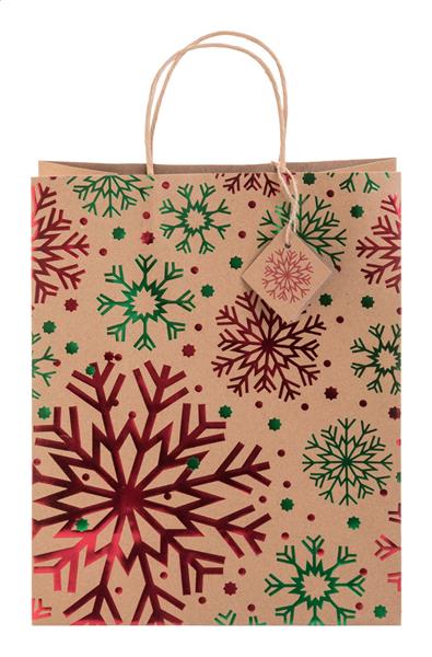 Torba prezentowa z papieru pakowego z recyklingu z bożonarodzeniowym wzorem wytłoczonym folią, ze skręconymi uchwytami i zawieszką prezentową. 140 g/m2.