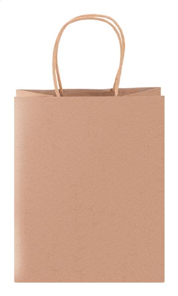Torba prezentowa z papieru pakowego z recyklingu z bożonarodzeniowym wzorem wytłoczonym folią, ze skręconymi uchwytami i zawieszką prezentową. 140 g/m2.