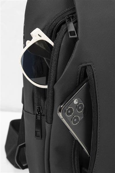 Wodoodporna torba typu sling z RPET, kieszeniami zapinanymi na zamek, zapięciem na klamrę i wyściełanym tyłem. Z regulowanym paskiem na ramię z możliwością regulacji na lewą i prawą stronę. Wykonana z poliestru 600D RPET powlekanego poliuretanem, z charakterystyczną metką RPET.