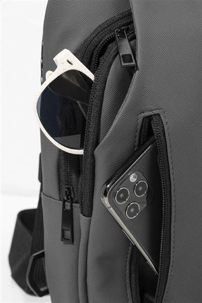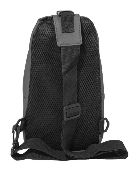 Wodoodporna torba typu sling z RPET, kieszeniami zapinanymi na zamek, zapięciem na klamrę i wyściełanym tyłem. Z regulowanym paskiem na ramię z możliwością regulacji na lewą i prawą stronę. Wykonana z poliestru 600D RPET powlekanego poliuretanem, z charakterystyczną metką RPET.