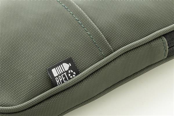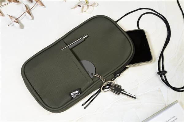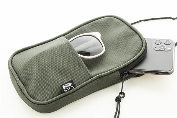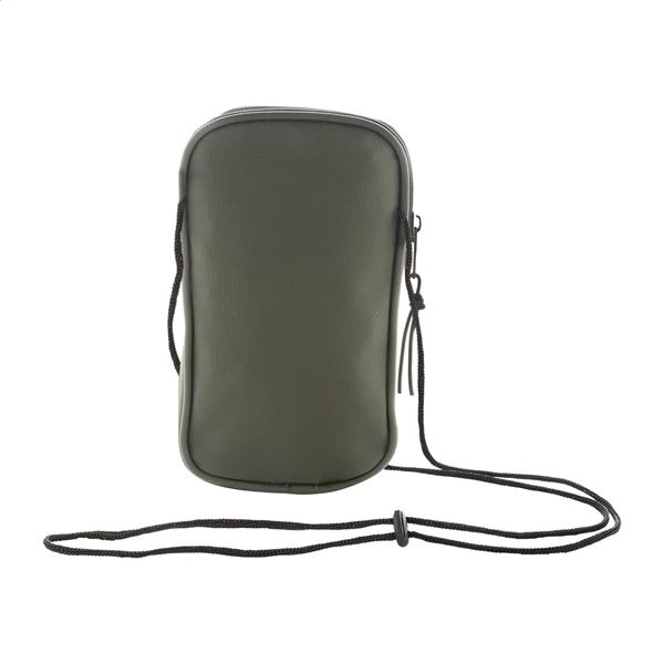 Wodoodporna torba na telefon komórkowy z RPET, z główną komorą zapinaną na zamek, przednią kieszenią i regulowanym sznurkiem. Poliester 600D RPET powlekany poliuretanem, z charakterystyczną metką RPET.
