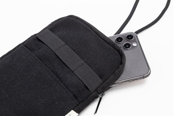 Torba na telefon komórkowy z płótna z recyklingu, z główną komorą zapinaną na zamek, kieszenią z przodu i regulowanym sznurkiem z poliestru RPET. Wykonana w 70% z bawełny z recyklingu i w 30% z poliestru RPET. Z charakterystyczną metką z bawełny z recyklingu.