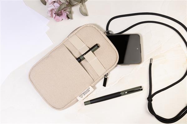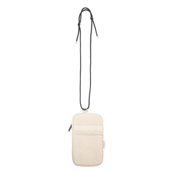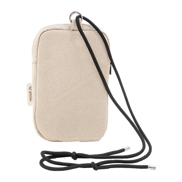 Torba na telefon komórkowy z płótna z recyklingu, z główną komorą zapinaną na zamek, kieszenią z przodu i regulowanym sznurkiem z poliestru RPET. Wykonana w 70% z bawełny z recyklingu i w 30% z poliestru RPET. Z charakterystyczną metką z bawełny z recyklingu.