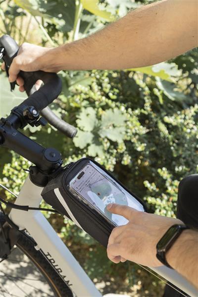 Torba na ramę roweru RPET z przegrodą zapinaną na zamek, kieszenią na telefon komórkowy z ekranem dotykowym, regulowanymi paskami na rzepy i odblaskowymi paskami. Poliester RPET 600D, z charakterystyczną metką RPET.