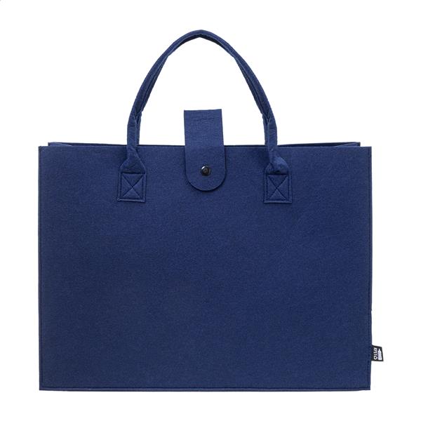 Torba na zakupy z filcu RPET z dnem, zapięciem na guziki i krótkimi uchwytami. Z charakterystyczną metką RPET.