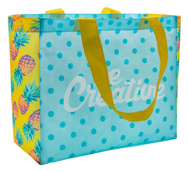 Description: Własnego projektu torba na zakupy z włókniny z wkładką i długimi uchwytami. 80 g/m2. Drukowana po całości. Min. ilość: 25szt. Primary Color: biały Gramatura 1: 80 g/m2 Material 1: Włóknina Rozmiar: 340×290×145 mm Pojemność torby: 14.3 l
