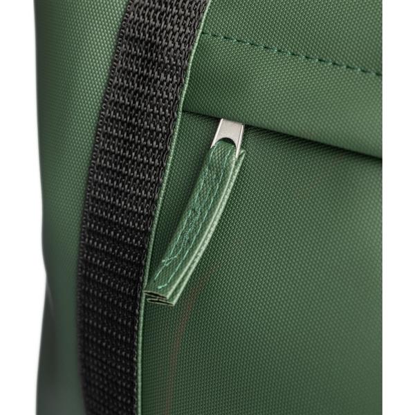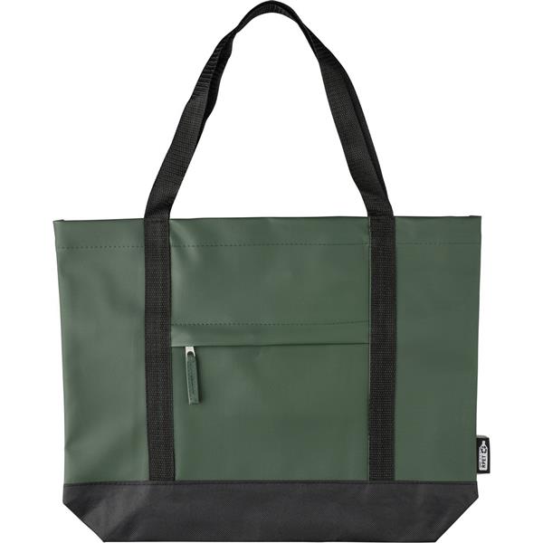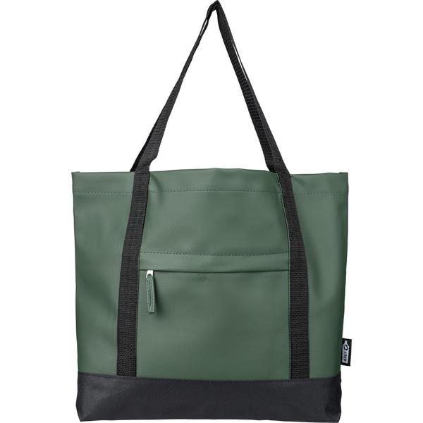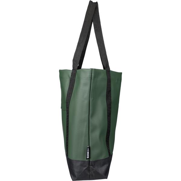 Torba na zakupy z dwustronną powłoką zapewniającą wodoodporność, pojemność: 10 l, udźwig: 10 kg, długie uchwyty ułatwiające noszenie, dwie zapinane kieszenie, kieszeń wewnętrzna, ikona RPET na metce, produkt wykonany z RPET