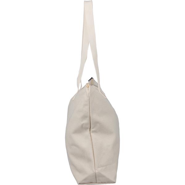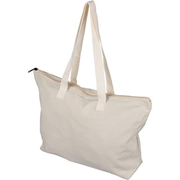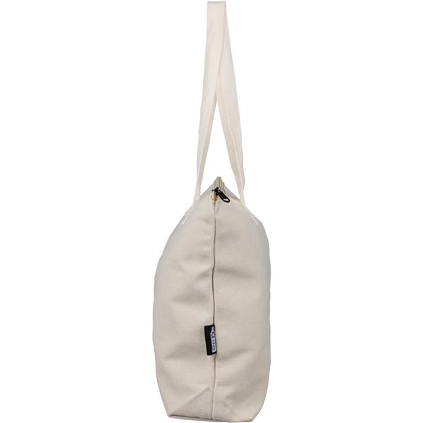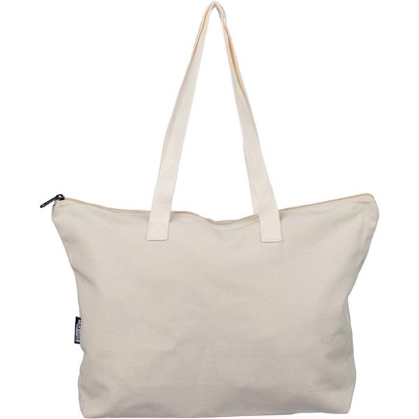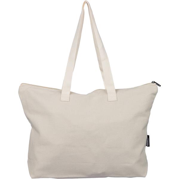 Torba na zakupy 330 g/m2, duża kieszeń zapinana na zamek, posiada długie uchwyty umożliwiające noszenie na ramieniu (65 x 2,5cm), ikona RPET na metce, produkt wykonany z polibawełny z recyklingu, poliestru i RPET