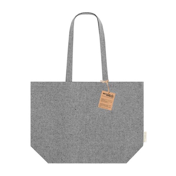 Torba na zakupy, posiada długie uchwyty umożliwiające noszenie na ramieniu, produkt wykonany z bawełny z recyklingu 220 g/m2