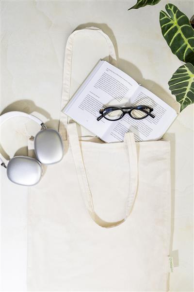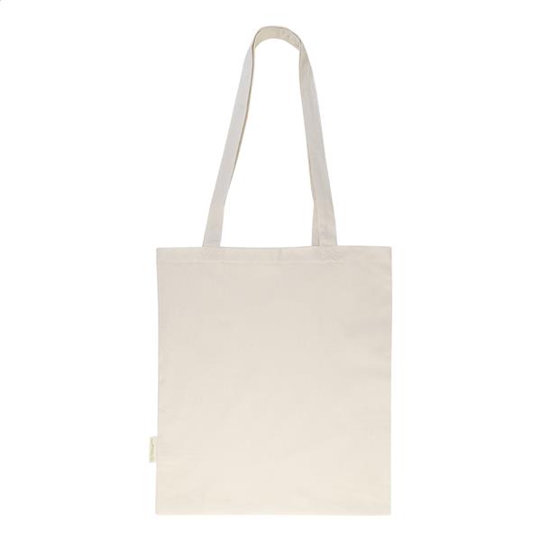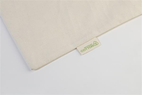 Torba na zakupy z długimi uchwytami, wykonana w 70% z bawełny z recyklingu i w 30% z poliestru RPET, o gramaturze 140 g/m2. Z charakterystyczną metką z bawełny z recyklingu.