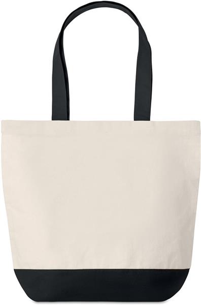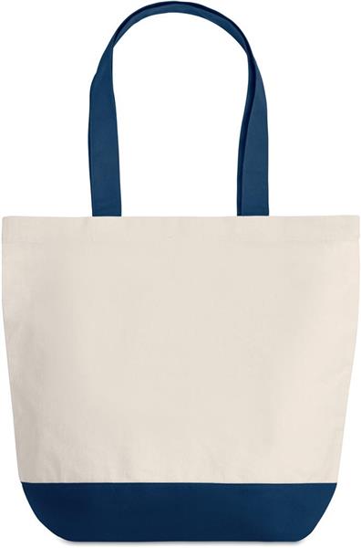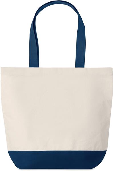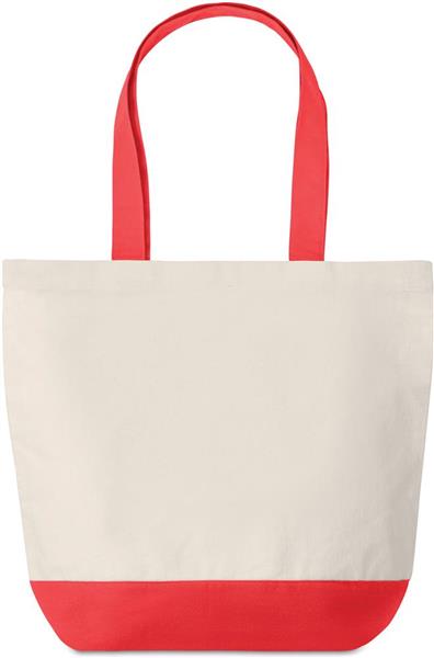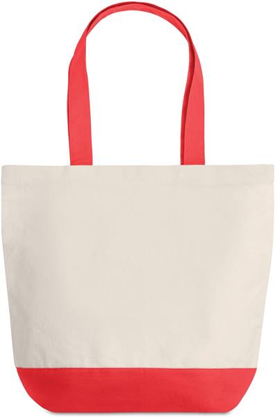 Płócienna torba na zakupy o gramaturze 280gr/m2 z kolorowymi detalami na dole i pasującymi uchwytami (posiada wewnętrzną kieszeń ).