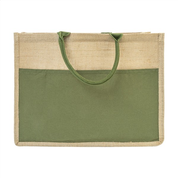 Laminowana torba plażowa z juty z bawełnianymi uchwytami i przednią kieszenią.