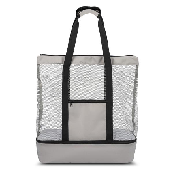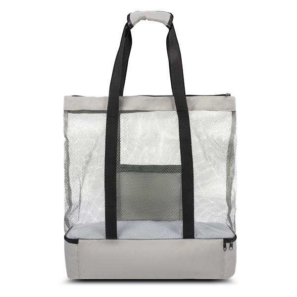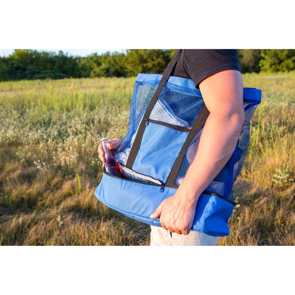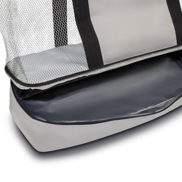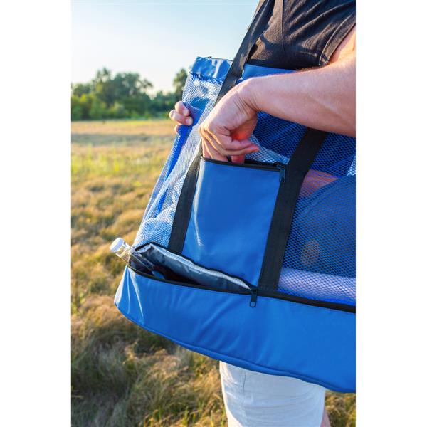 Torba plażowa, na zakupy, wykonana z poliestru RPET, zgodna z certyfikatem GRS (Global RecycIed Standard), z dolną przegrodą termoizolacyjną na zamek błyskawiczny, przednia kieszeń i siateczkowa przegroda główna na zamek błyskawiczny