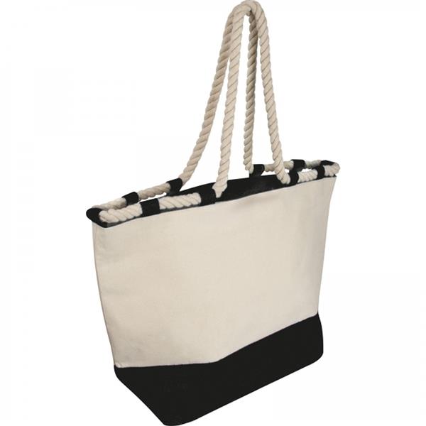 Torba z juty z uszami wykonanymi z grubego sznura, który służy do noszenia torby, a także do jej zamykania.