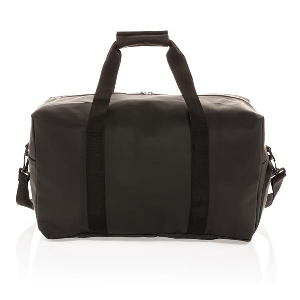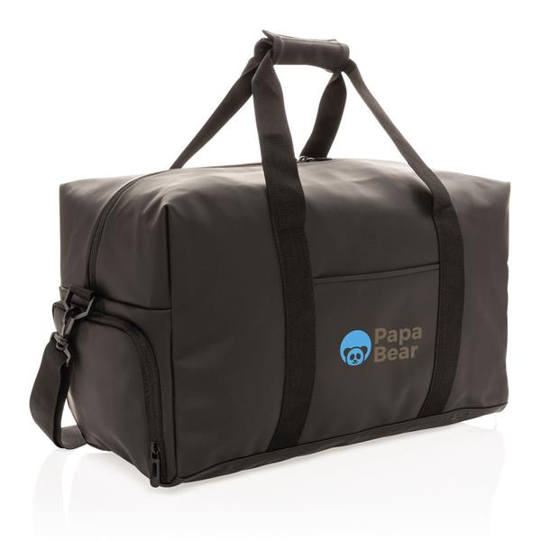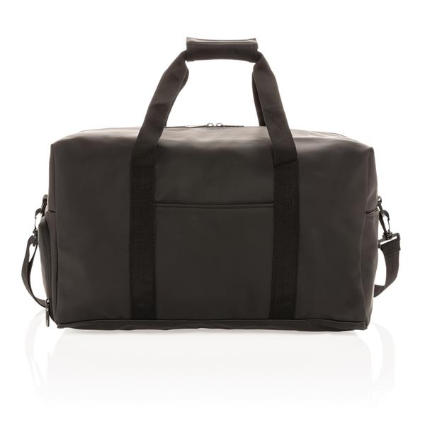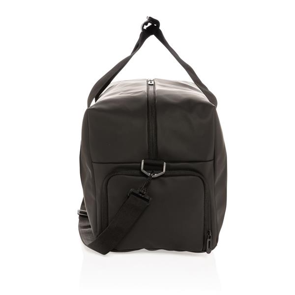 Torba podróżna, sportowa, wykonana z PU miękkiego, wewnątrz poliester 210D, minimalistyczny design, przestronna przegroda główna z kieszenią wewnątrz, kieszeń na buty z boku, z przodu kieszeń na akcesoria, posiada rączkę oraz regulowany pasek na ramię, nie zawiera PVC, ślad węglowy produktu: 4,65 kg CO2