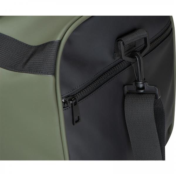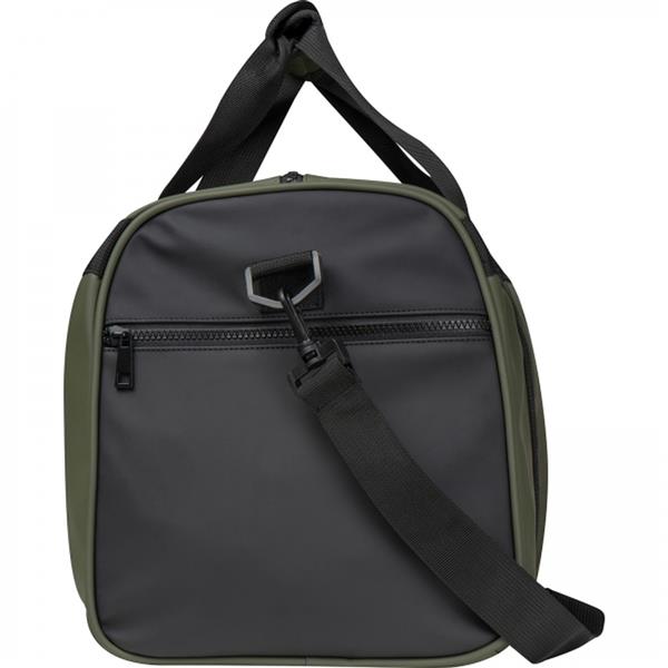 Duża torba podróżna wykonana z wodoodpornego PU z dwoma dużymi kieszeniami. Materiały: PU 210T (matowa powłoka), nylon, pianka EVA (spód torby, uchwyt do rączek).