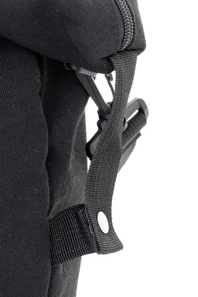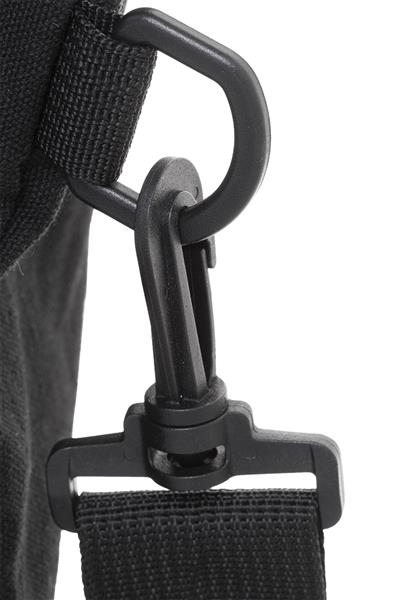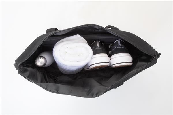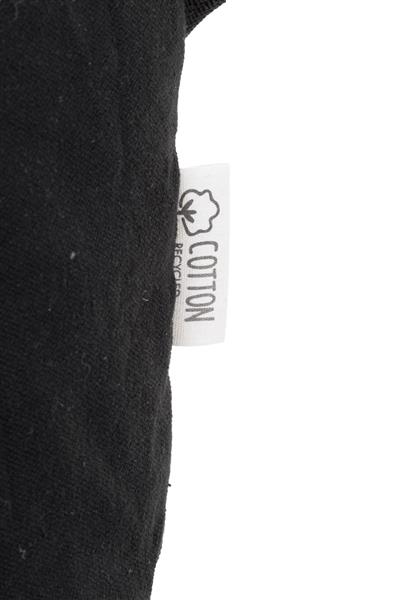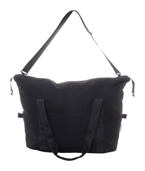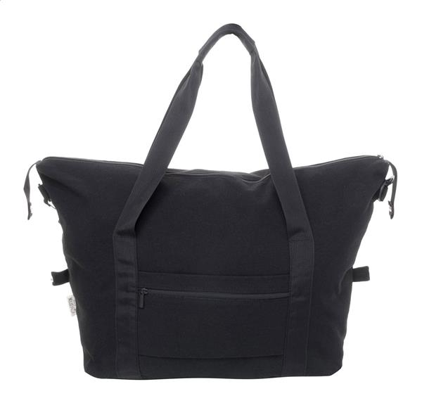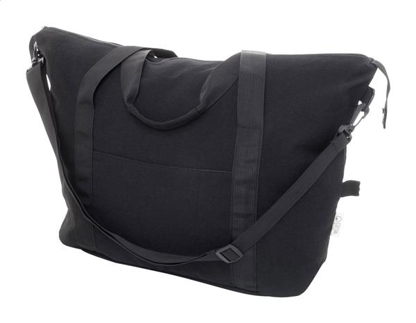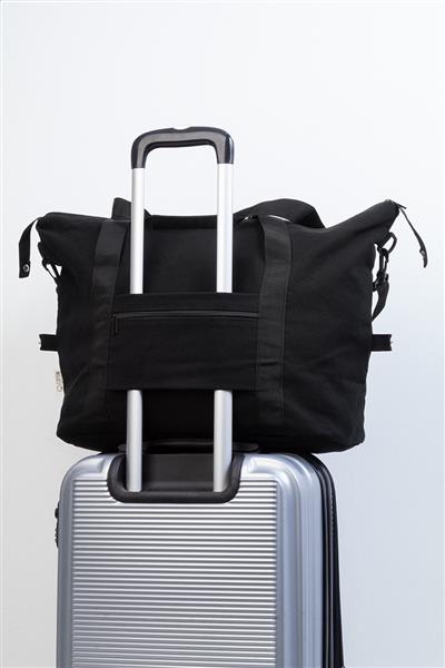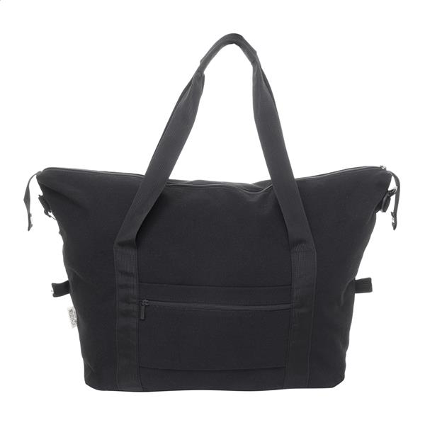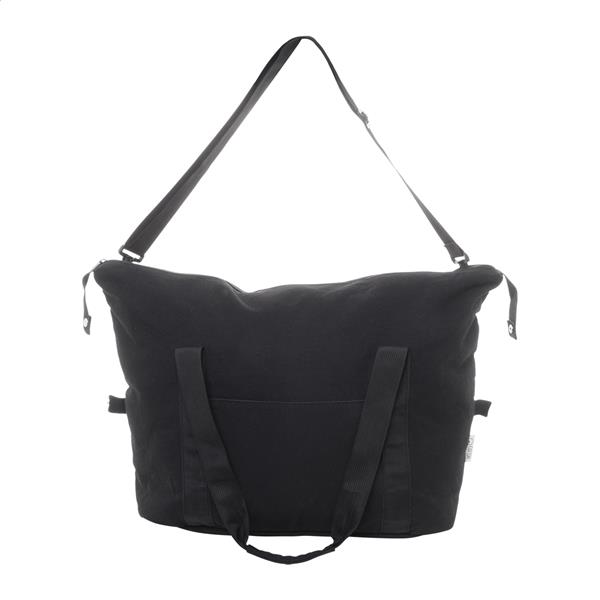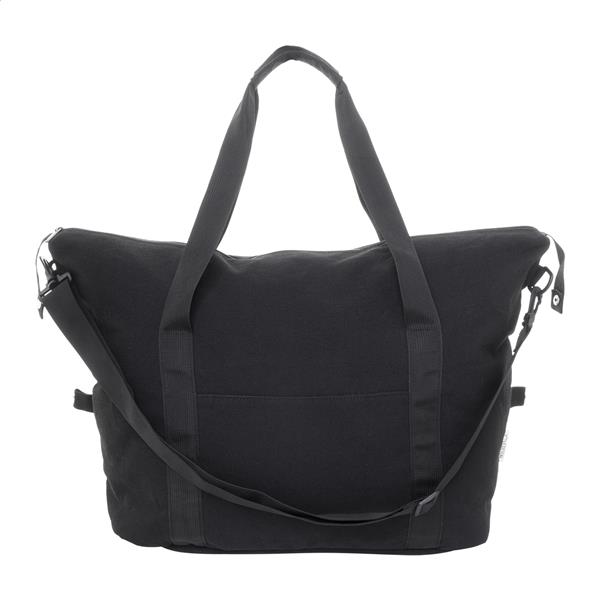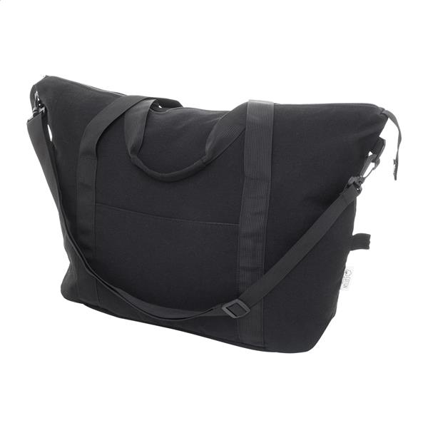 Torba podróżna/sportowa z płótna z recyklingu z główną kieszenią na suwak, kieszenią z przodu, regulowanym paskiem na ramię i kieszenią z tyłu z suwakiem, który może służyć również jako pasek do walizki. 70% bawełny z recyklingu i 30% poliestru RPET. Z charakterystyczną metką z bawełny z recyklingu.